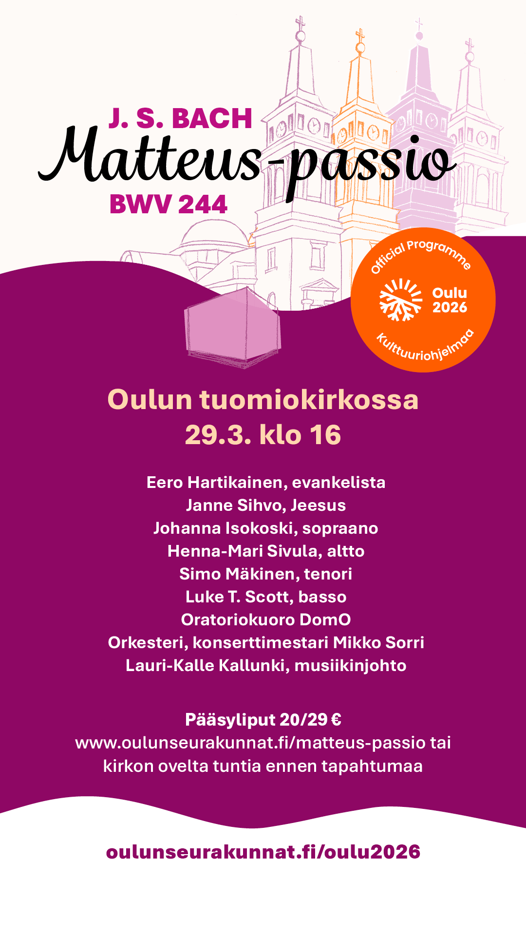 Laulamme jumalanpalvelusmusiikkia ja valmistamme kirkkomusiikkiteoksia Oulun tuomiokirkkoseurakunnan työn tukemiseksi ja kuorolaulun ystävien iloksi.